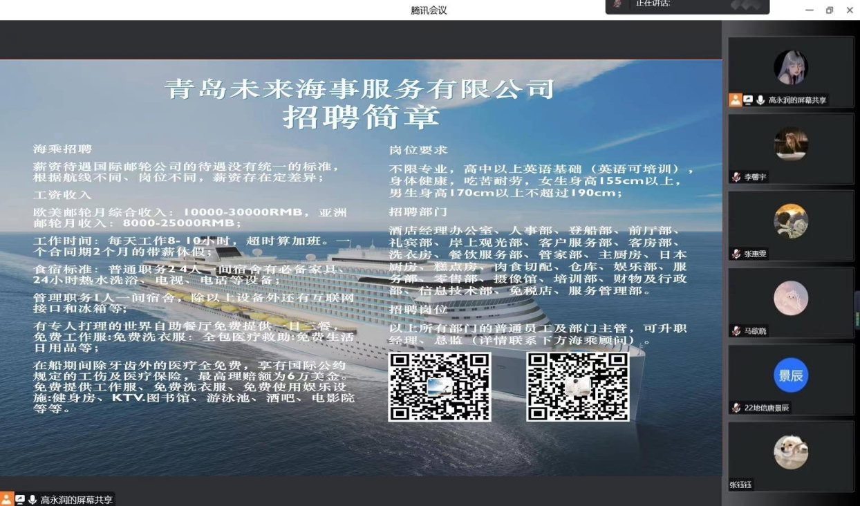 4月17日,伟德国际VICTOR1946与青岛未来海事服务有限公司通过线上平台成功举办海事工作招聘宣讲会。此次宣讲会由青岛未来海事服务有限公司吕良主讲,20级国际旅游、酒店管理专业全体员工参与。