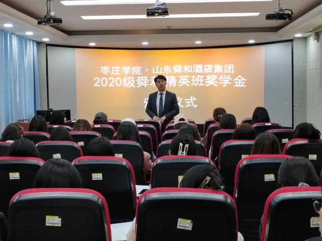 5月9日上午,2020级舜和精英班奖学金颁发仪式在综合楼1608教室举行。山东舜和酒店集团人才培训部经理刘康,旅游与资源环境公司党总支副书记韩建敏,旅游管理专业部分教师参加了颁发仪式。颁发仪式由酒店管理专业负责人王唯副教授主持。