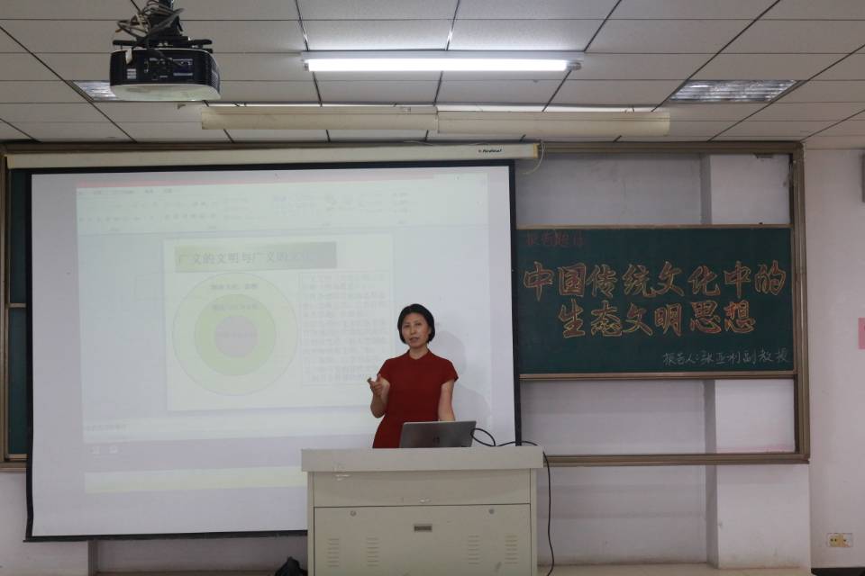 报告会伊始,张亚利老师介绍并强调:面对形势愈发严峻的环境问题,我们应该更加仔细研究我国传统文化中的生态文明思想,进一步挖掘其当代价值,与我国现实情况相结合。这对于我们保护生态环境,构建人与自然和谐发展的社会,全面落实科学发展观,具有十分重要的现实意义。随后,她还向同学们就传统文化中的生态文明思想展开了细致的分析,让同学们掌握了一些写论文的技巧,了解到更多关于生态文明的知识。讲解结束后,张亚利老师与同学们展开互动,对同学们提出的问题一一解答。最后,张老师对本次报告会作了总结,认为中国传统文化中的生态文明思想虽然可以引导并推进我国生态文明建设,但它具有一定的历史局限性。因此,为早日实现美丽中国梦,我们还需要更进一步对中国传统生态文明思想进行研究。