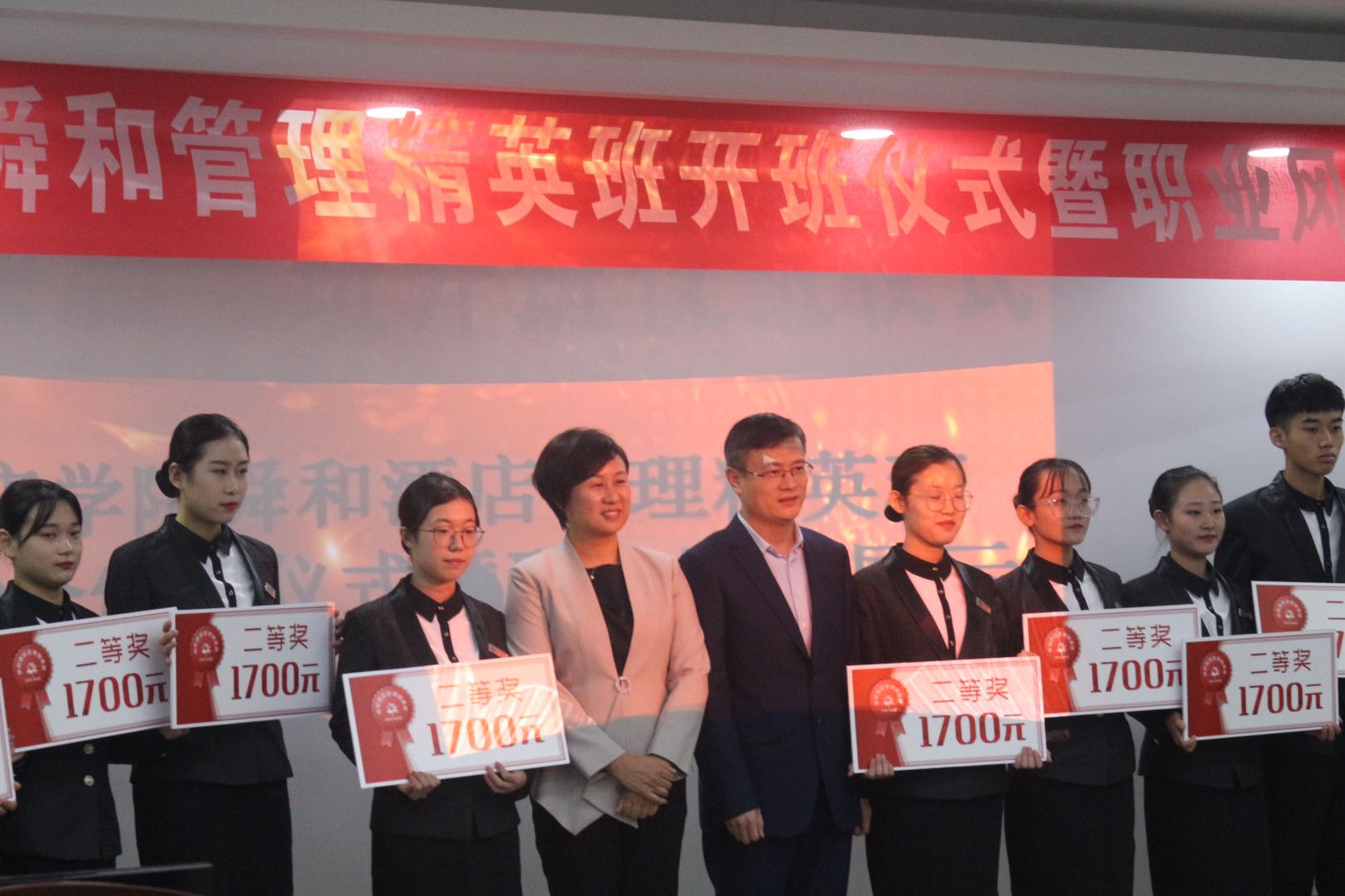 随后山东舜和集团为2019级旅游管理班员工颁发奖学金,共计7.174万元。2019级舜和酒店管理精英班举行了授旗仪式、文化展板以及职业风采展示。