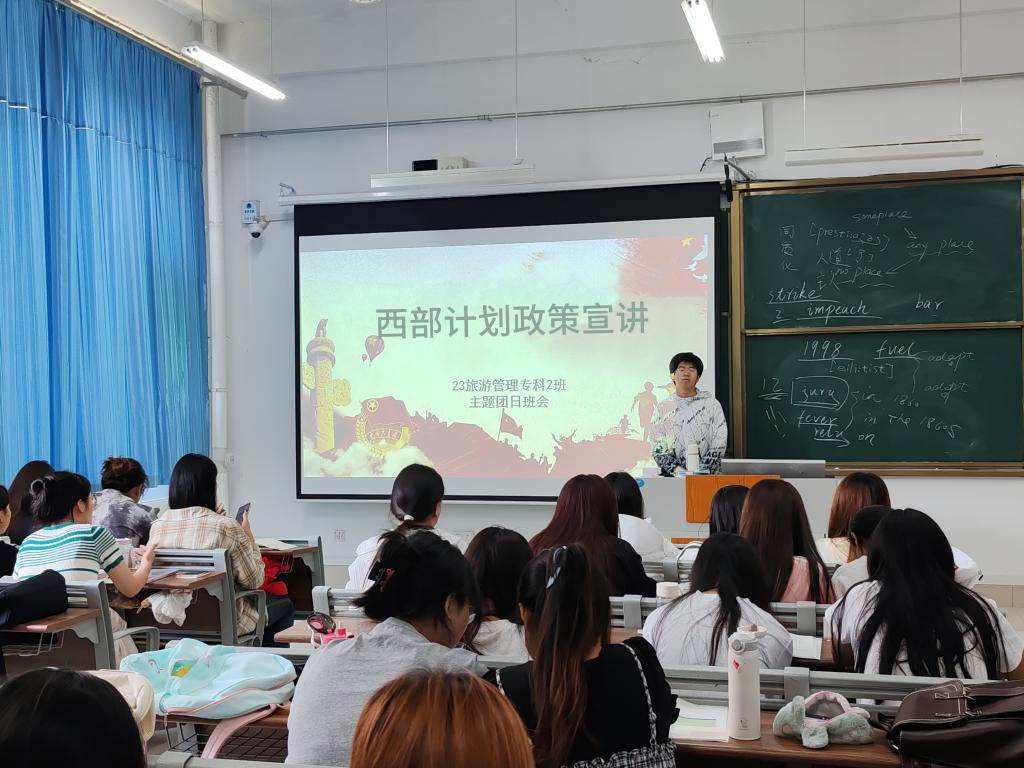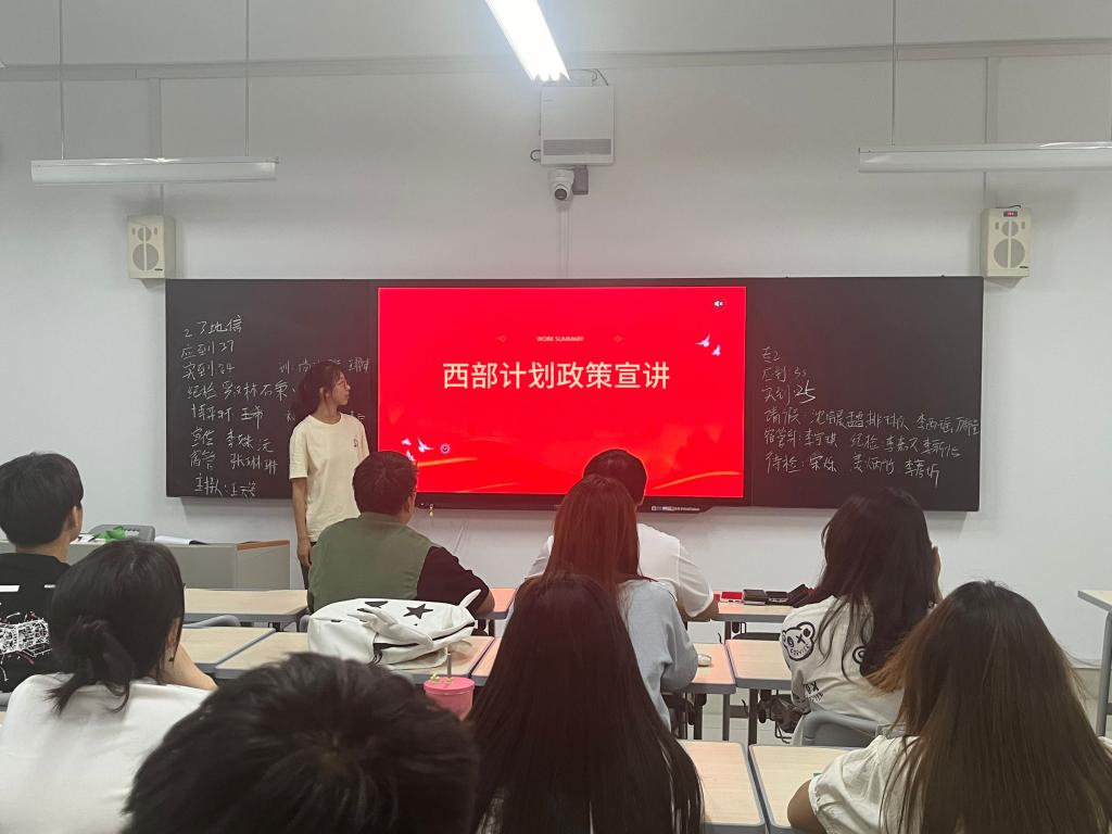 以青春之名,赴西部之约。本次西部计划政策宣讲系列活动,采用线上线下相结合的形式。活动初期,公司通过制作西部计划宣传板,为员工参与西部计划提供便捷的信息获取渠道。同时,各班级积极响应公司号召,于5月13日召开西部计划政策宣讲主题团日班会。各班主讲人结合ppt,围绕西部计划的报名流程、服务宗旨等方面,详细阐述了该政策的各项内容,初步建立了同学们对西部计划理解和认识,为后续深入学习奠定了良好的基础。