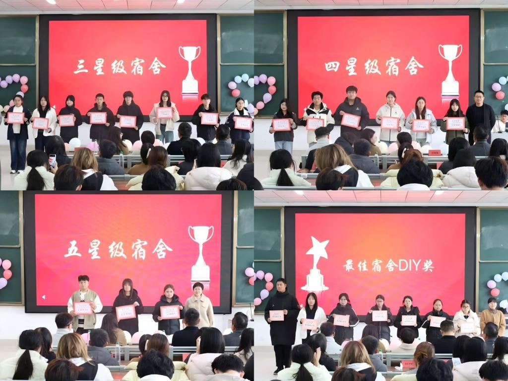本次评比活动经过激烈角逐,共产生五星级宿舍3个、四星级宿舍6个以及三星级宿舍9个。此外,为丰富宿舍文化载体,活动还特别设立最佳宿舍DIY奖,最佳宿舍微视频奖和最佳知识竞答奖项。在颁奖仪式现场,宿管部对获奖宿舍的手工作品和宿舍短片进行精彩展播。这些作品不仅展示同学们多才多艺的一面,也生动地传达宿舍成员间的深厚情谊和对文明宿舍的深刻理解。