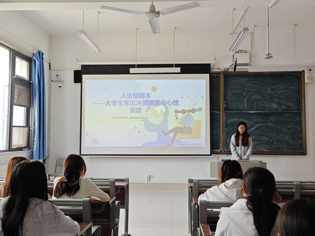 讲座伊始,主讲人以“人生错题本"为切入点,引出学业迷茫、生涯规划失衡、情感问题等常见决策误区,并结合现实案例和社会热点深入讲解如何通过“参考类别预测“修正决策误区,构建“试错-复盘-迭代”的成长型思维,减少决策失误。同时,主讲人针对“情绪管理”和“人际交往”两项老员工高发心理问题展开剖析,与同学们探讨如何在快节奏现代生活中调节负面情绪,保持心理健康。最后,主讲人强调遇到心理困扰时要及时寻求专业帮助,鼓励同学们树立“预防重于治疗"观念,要积极正视心理问题,促进个人健康发展。