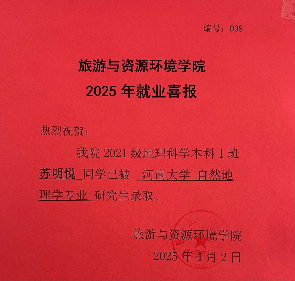 喜报!21地理科学本科1班苏明悦被河南大学录取!