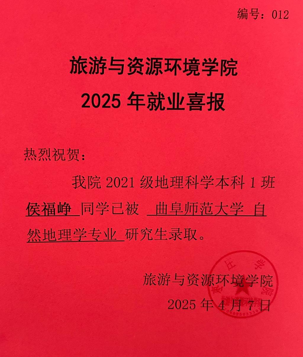 喜报!21地理科学本科1班侯福峥被曲阜师范大学录取!