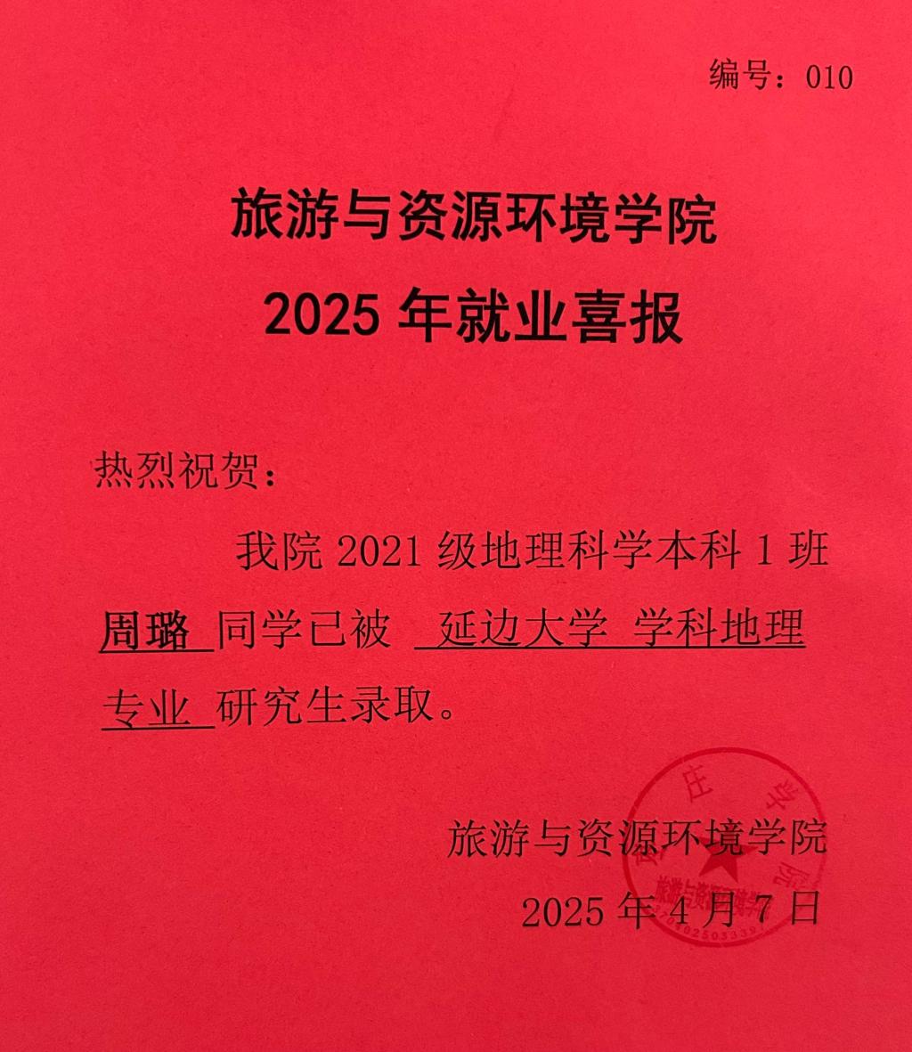 喜报!21地理科学本科1班周璐被延边大学录取!